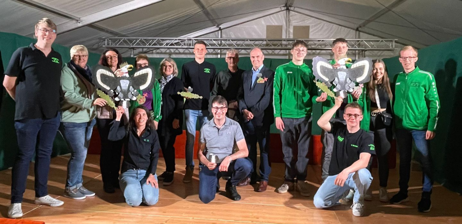 Bild: außenstehend Lukas Bott und Luisa Traud (Vorstand), von rechts nach links: Platz 1-5: Marcel Maurer, Florian Gies, Matthias Bott, Dominik Merz und Boris Staubach